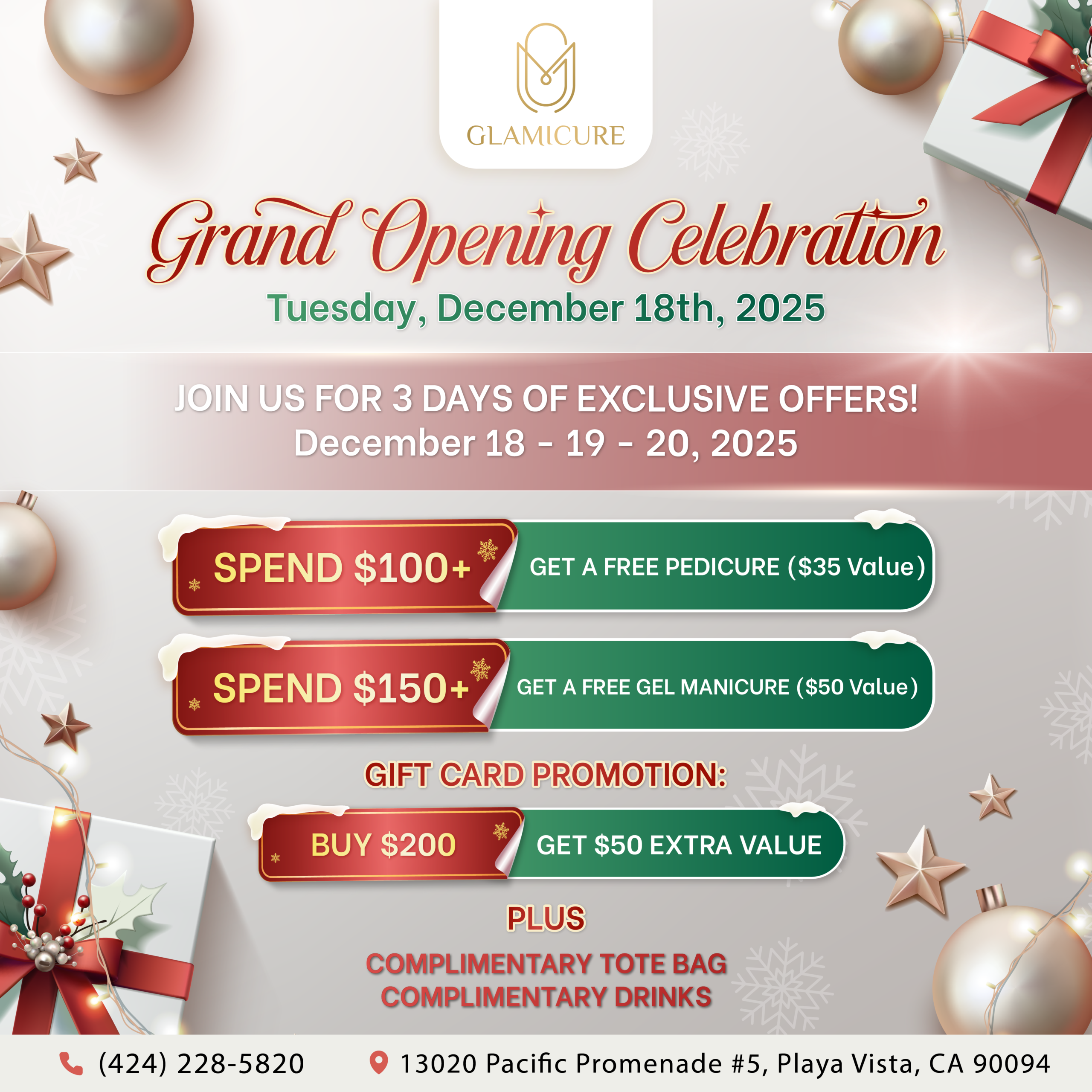Welcome to Glamicure — where premium care meets modern artistry. Nestled in Playa Vista, we’ve created a beauty destination for those who value clean technique, high-end products, and polished results. Our team of licensed professionals delivers elevated nail services, sculpted extensions, and luxurious lash treatments with unmatched precision and style. It’s not just pampering — it’s performance-level beauty, every time.